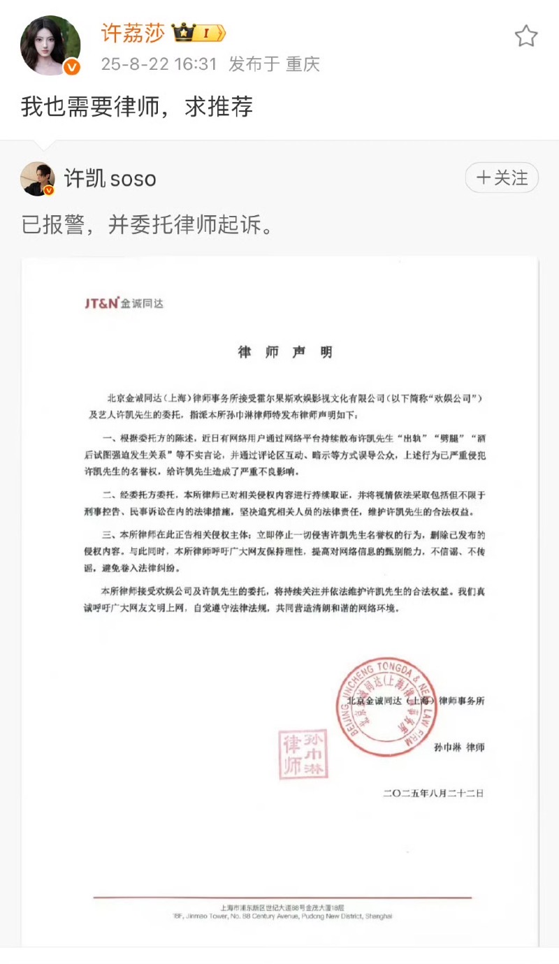 沒想到許荔莎立刻就轉發了許凱微博,還讓許凱也給自己介紹律師👇