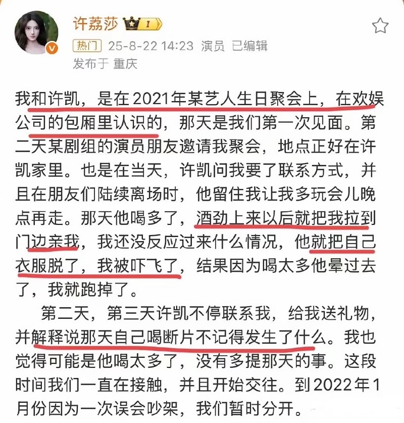 媽啊!這嫂子好剛啊!是達,許荔莎在22號這天火力全開爆料稱劈腿的前男友許凱,隨後許凱發文回應,公開了律師信表示已經報警,但沒有公開報警證據👇