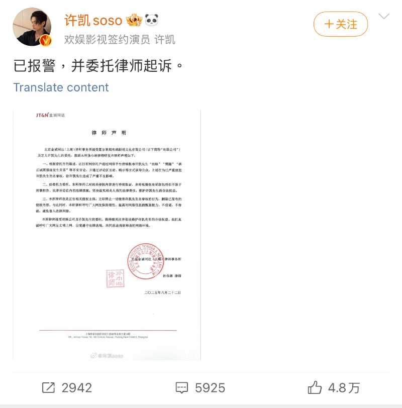 隨著熱議,許凱在22號下午發微博回應,簡短表示:「已報警,並委託律師起訴。」隨之公開的是律師聲明,裡面提到的是所有網傳皆是虛假構造,不過沒有公開報警證明。