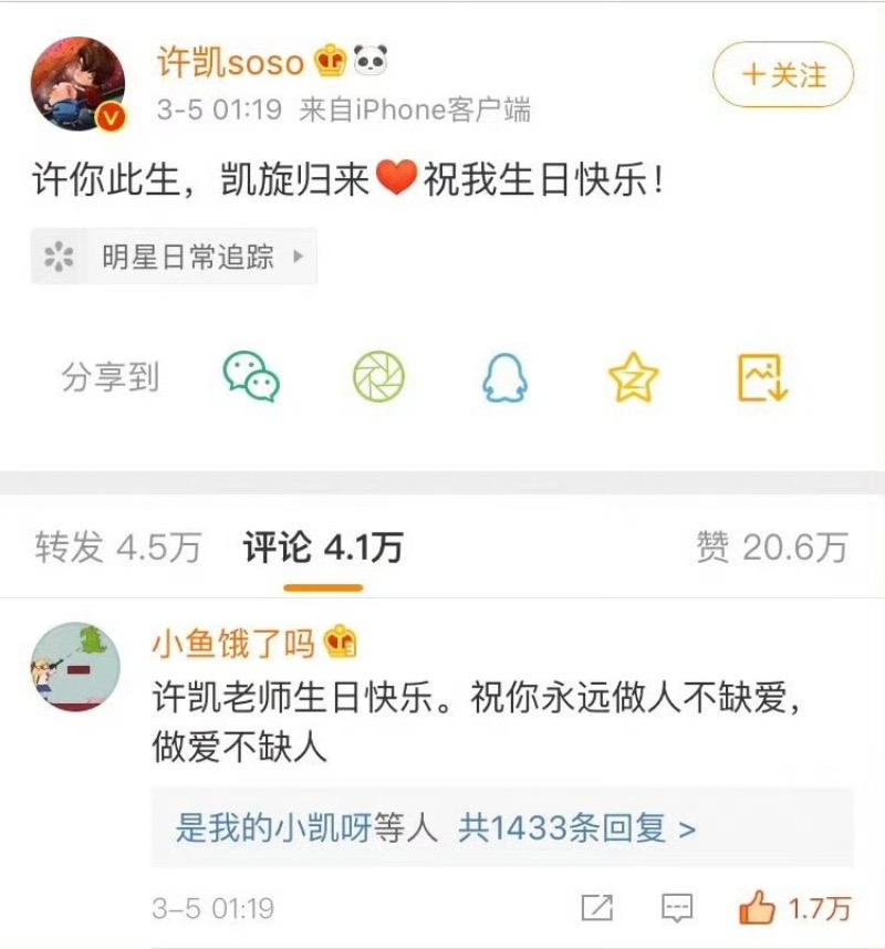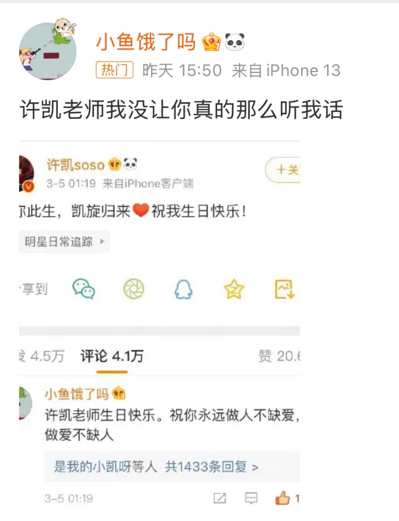 而許凱老粉絲也來倒油!沒錯,提到許凱老粉,這位「小魚餓了嗎」絕對很出圈!因為這位粉絲曾在許凱生日時,送上超18禁的祝福:「許凱老師生日快樂。祝你永遠做人不缺愛,做愛不缺人」當時直接上了熱搜!