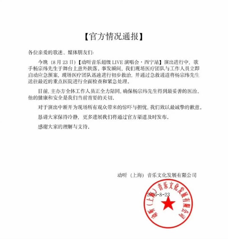 隨後,主辦單位發文發文道歉,表示楊宗緯已經通過急救通道,送往最近的重點醫院進行全面檢查和緊急處理。