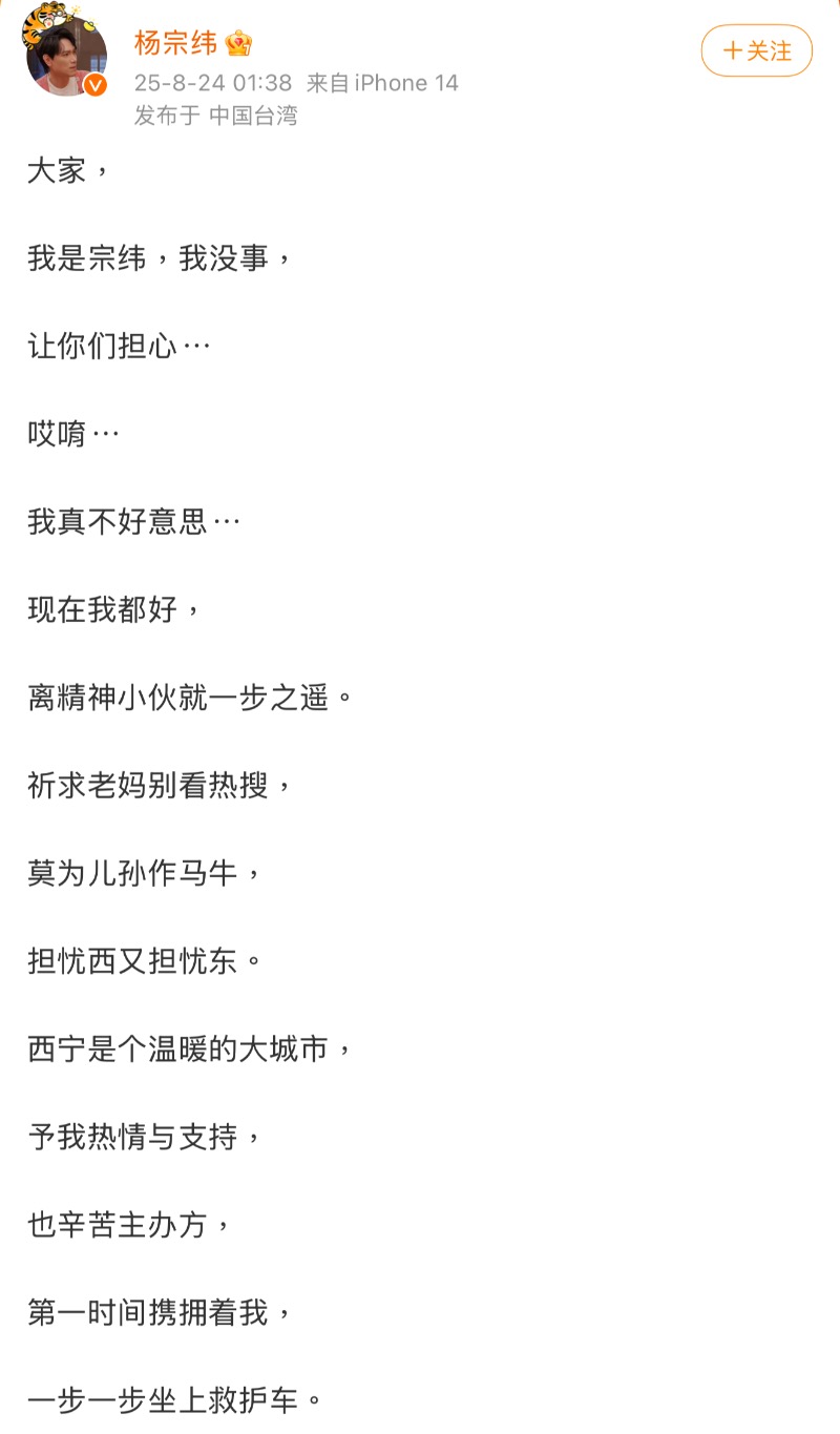 而楊宗緯也在深夜發文,表示一切都好:「離精神小夥就一步之遙」,但最不希望家人為他擔憂。他表示主辦方第一時間讓他就醫、醫護人員也讓他安心:「我真的受到大家好多的照顧,好好的照顧,我們都要好好的,所以請放心,我會好好的。」