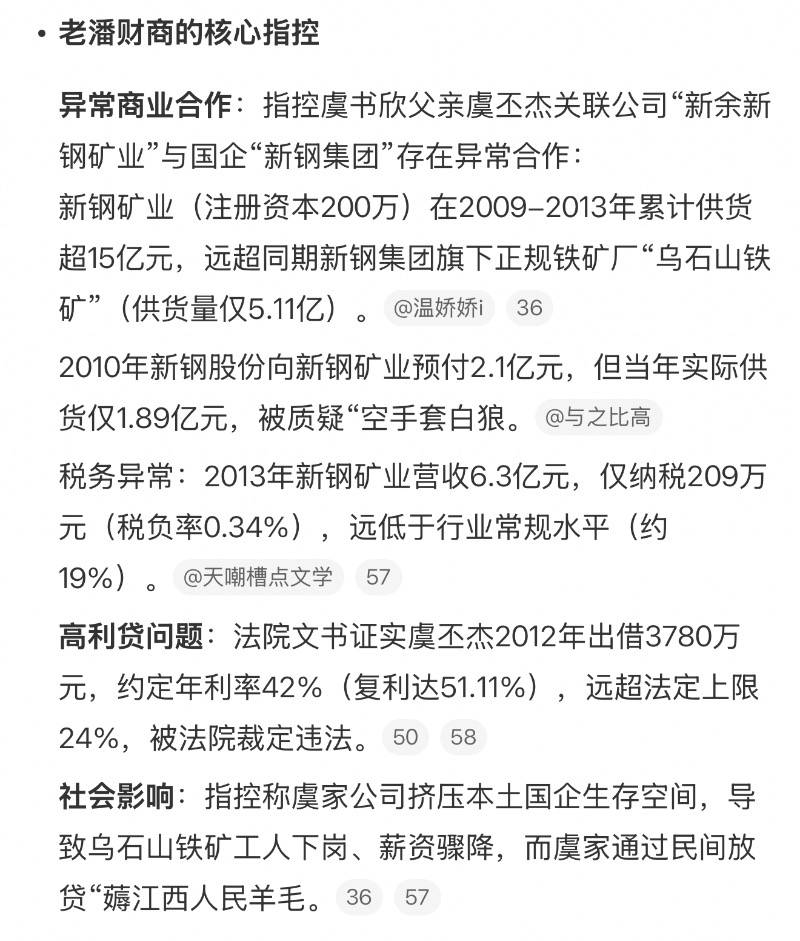 第一集中,老潘就直指虞書欣父親虞丕傑是放高利貸的,當中對其旗下公司「新余新鋼礦業」存在借國企(江西新余鋼鐵集團)合作套資、放高息貸(年利率達42%,遠超法定上限)等問題,還牽扯出稅務異常、資産轉移等質疑。