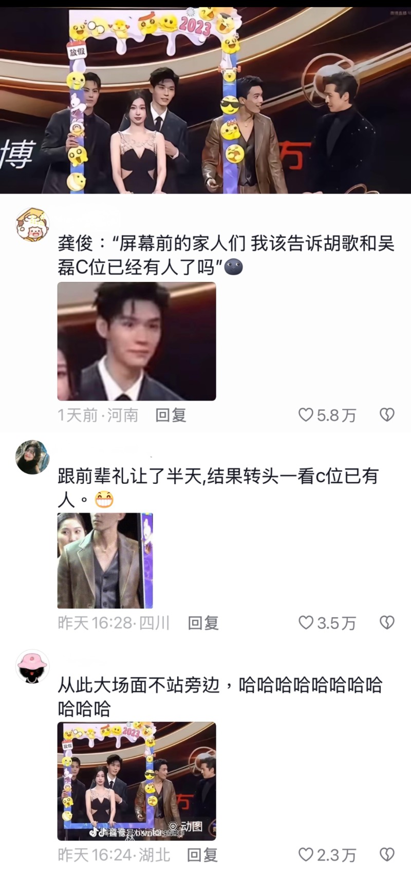 連她之前在頒獎典禮上的反應也被內涵!當時吳磊和胡歌互相退讓C位,結果發現虞書欣已經站在了C位👇