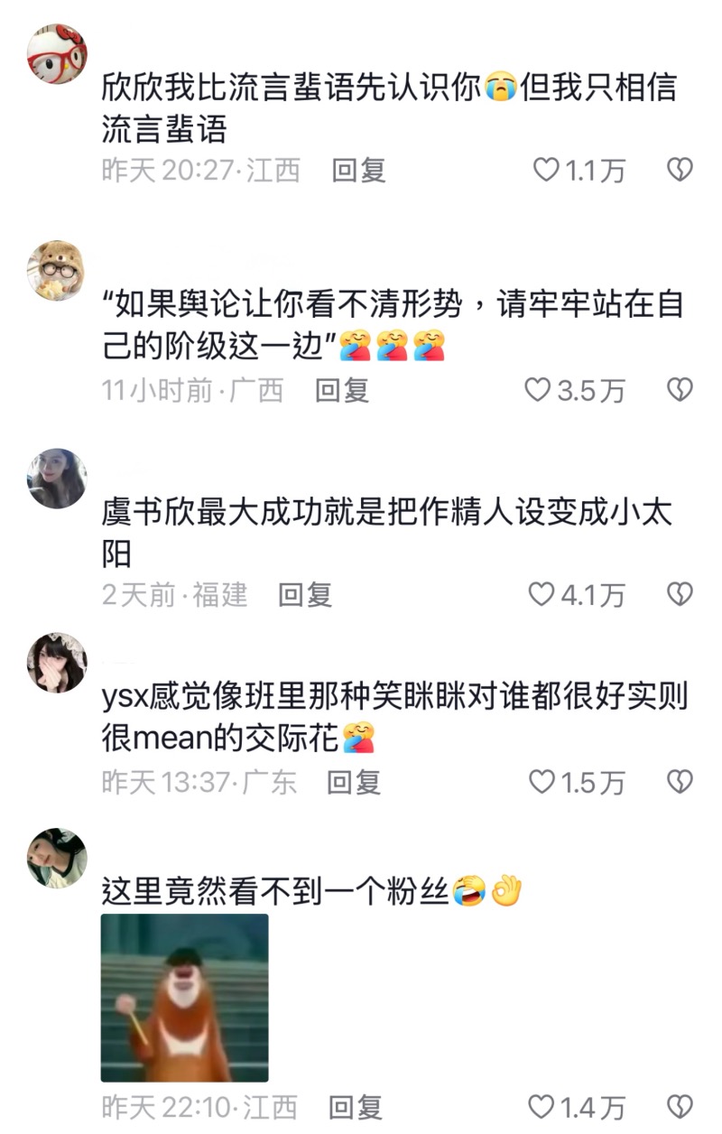 而虞書欣這兩天評論區可以說全面淪陷,點進去熱評都是路人玩梗,比如貼她的內涵圖👇