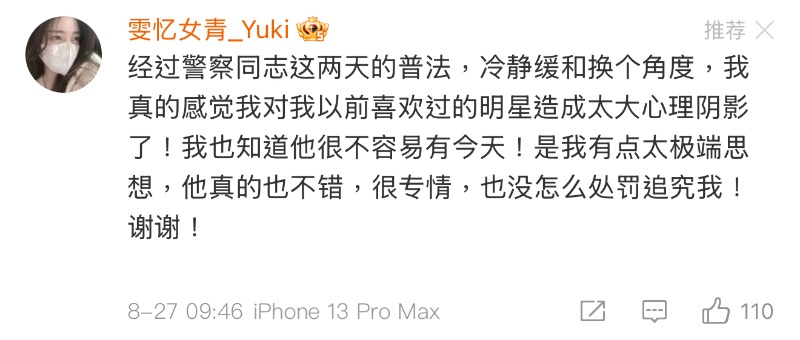 該網友表示經過警察的普法,知道自己有點太極端思想,並表示:「他真的很不錯,很專情,也沒怎麼處罰追究我!謝謝!」