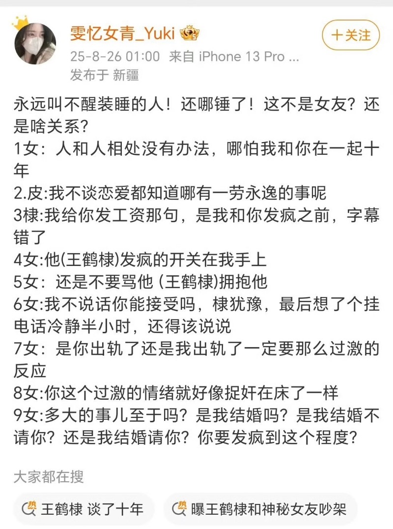 雖然但是,最後她刪除了所有發過的有關王鶴棣的貼文!而因為這次錄音爭議,「王鶴棣 談了十年」掛在熱搜一天,而他出道前的女友劉藝再次被熱議,因為兩人2022年就被爆出已經交往6年,算算時間線被指對上了!