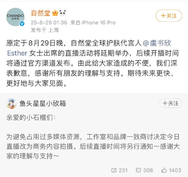 隨著熱議,虞書欣原定與29號晚上直播的品牌,在凌晨緊急發聲明表示直播延期👇