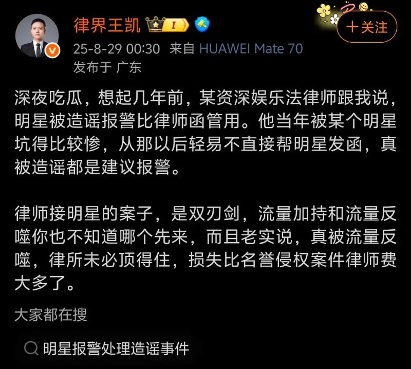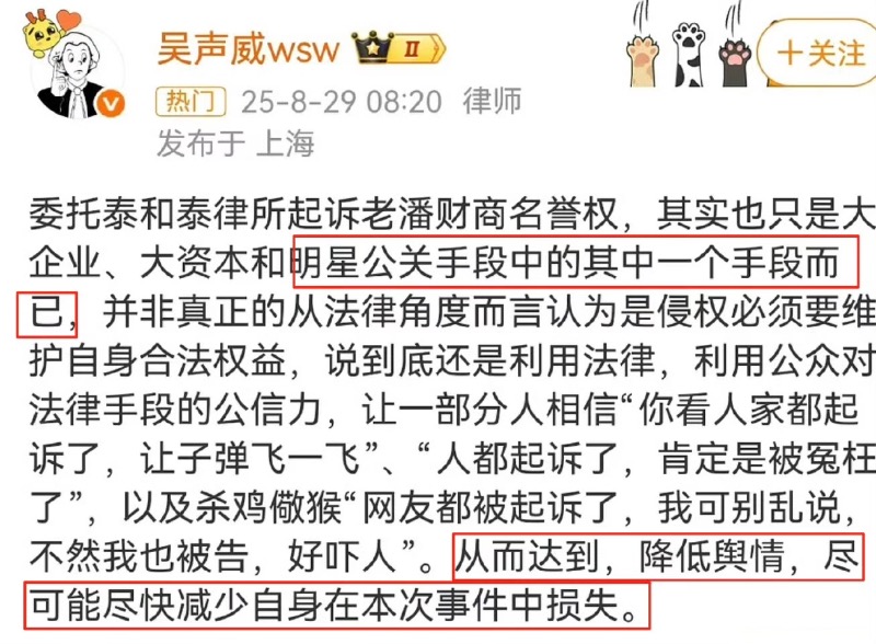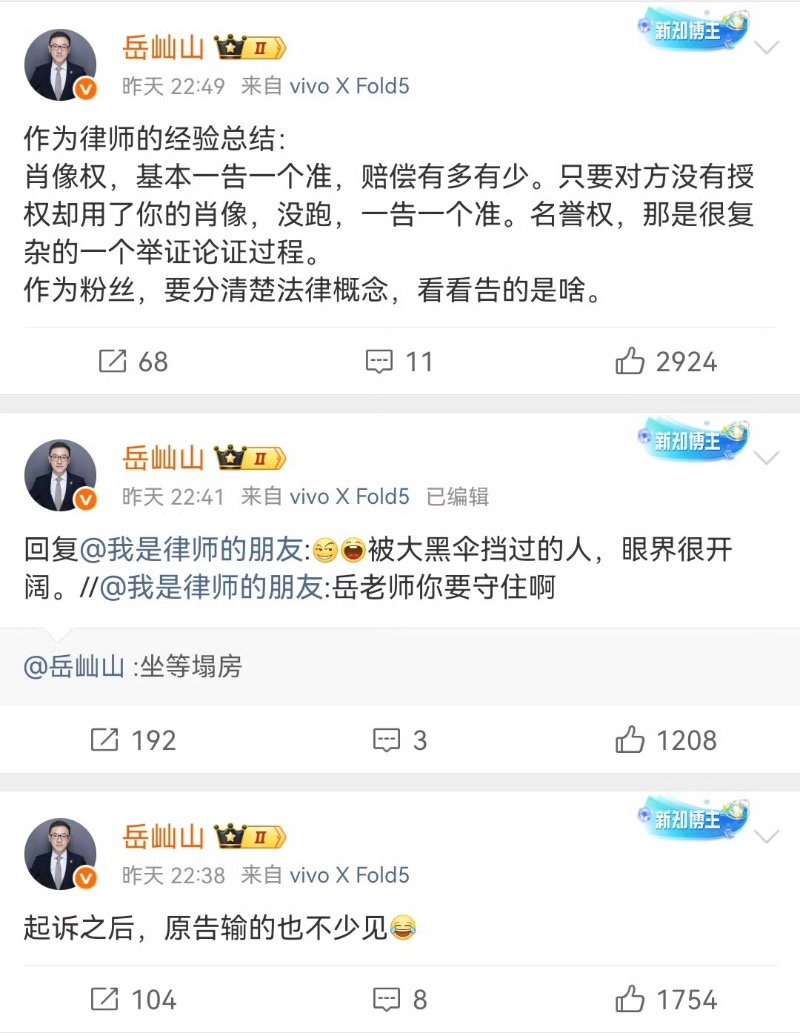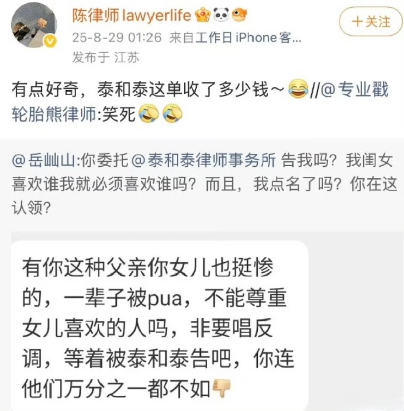 岳屾山親上前線和飯圈對線,馬上在律師群出圈,開始有律師站出來直接質疑泰和泰律所,為什麼連律師函都沒發,僅透過公眾號發委託聲明👇