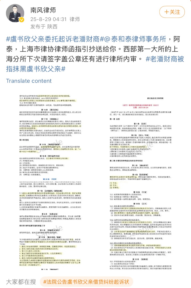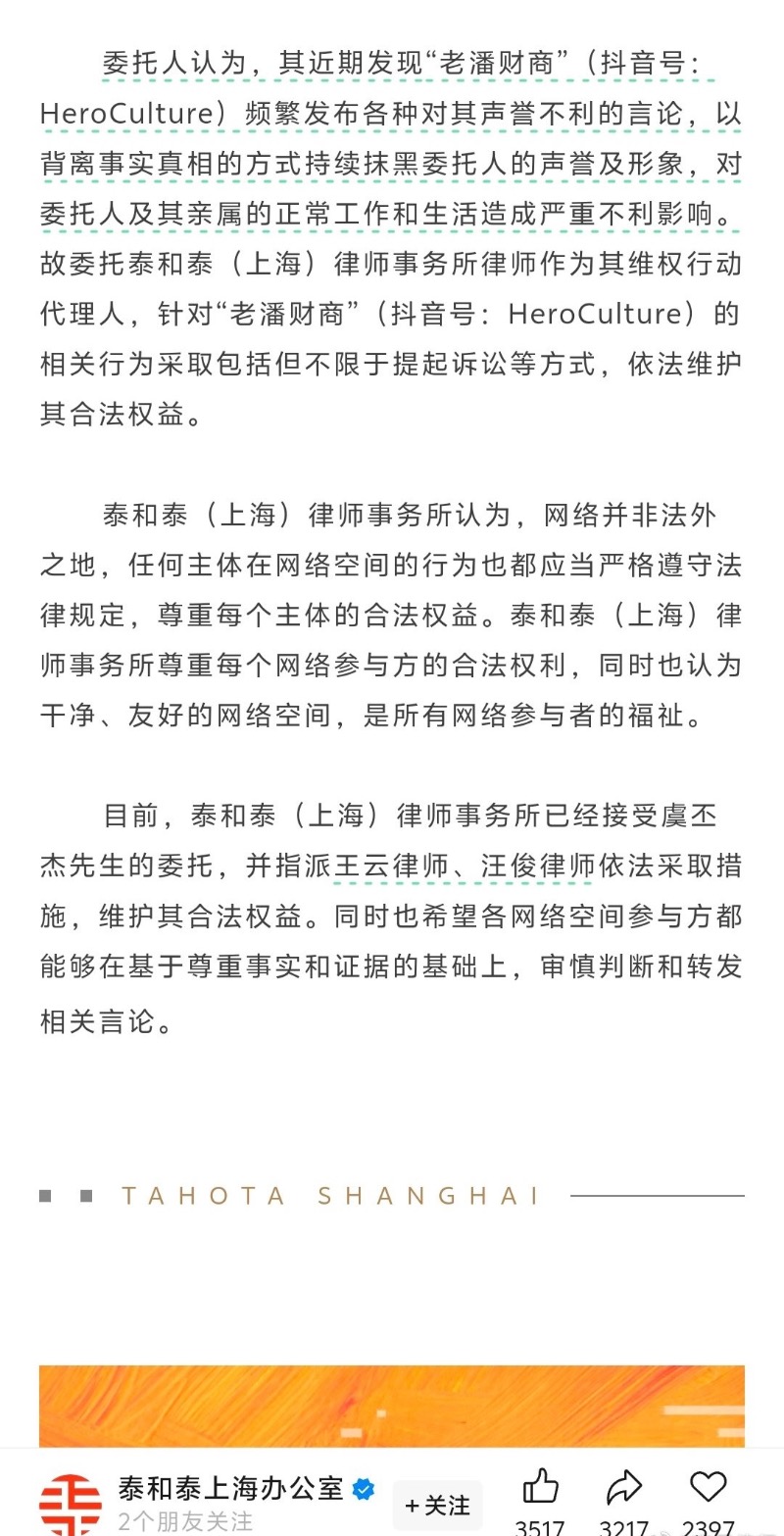 在28號晚間,上海泰和泰律所透過公眾號,表示接到虞書欣父親的委託,將對質疑他的「老潘財商」提出名譽權訴訟,引起了關注👇