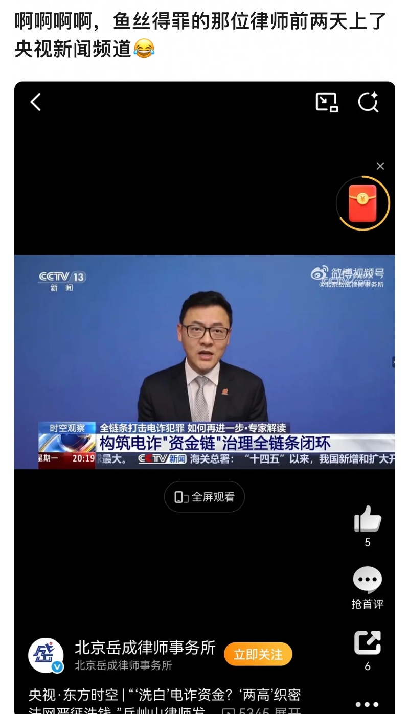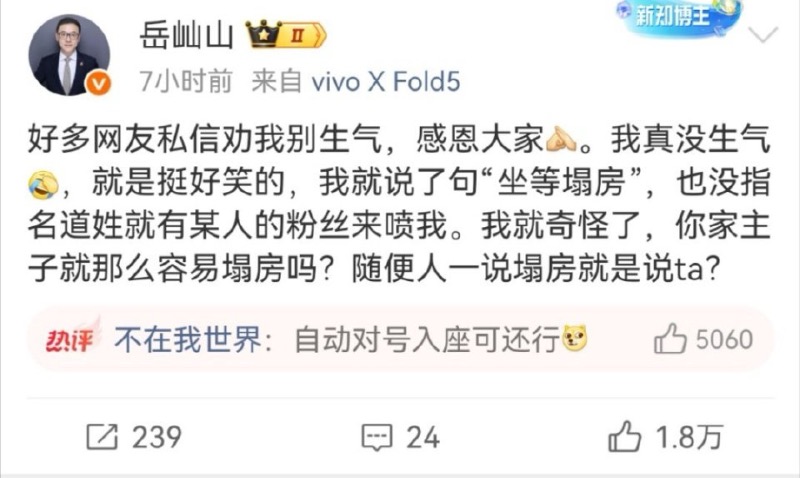 沒想到曾參與《令人心動的offer》、同時也是中央電視台特約律師的岳屾山,居然在28號晚間發了則「坐等塌房」的微博,並在評論區回應,表示是女藝人👇