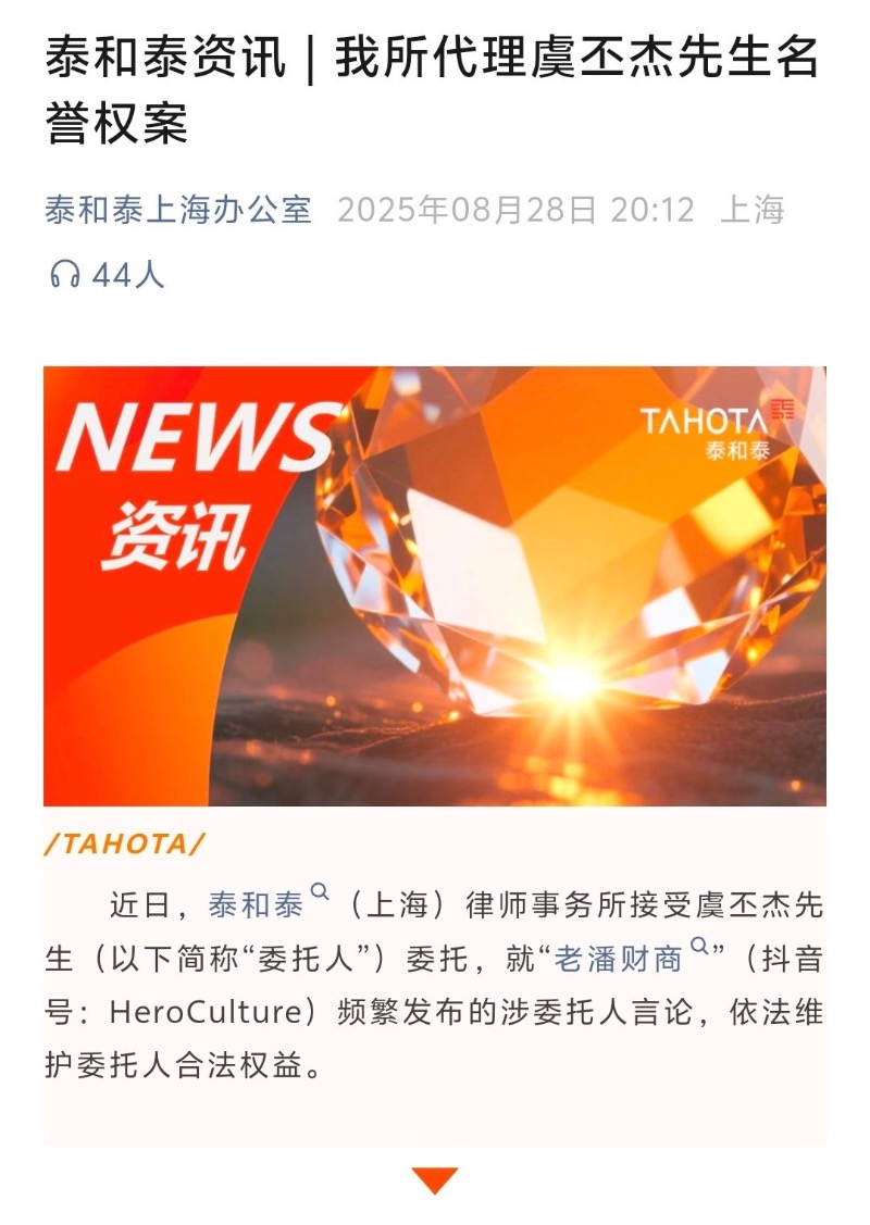 在28號晚間,上海泰和泰律所透過公眾號,表示接到虞書欣父親的委託,將對質疑他的「老潘財商」提出名譽權訴訟,引起了關注👇