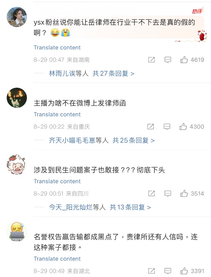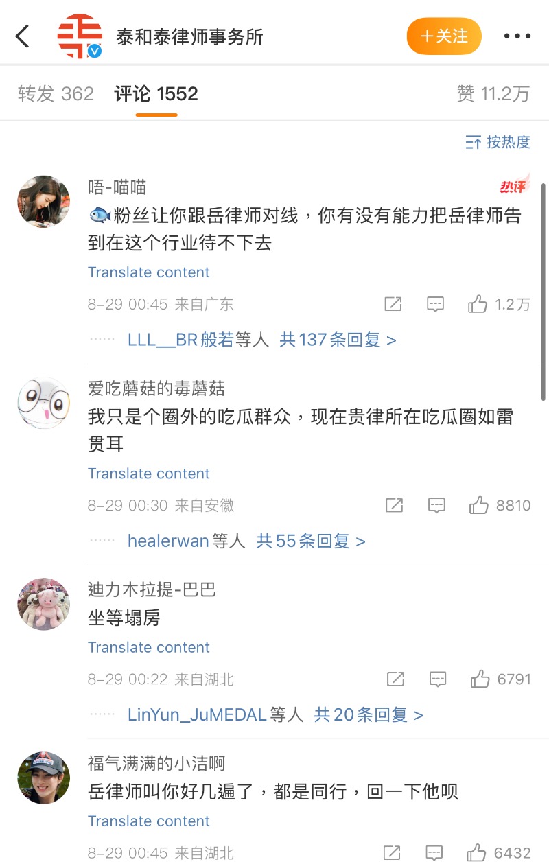 岳屾山親上前線和飯圈對線,馬上在律師群出圈,開始有律師站出來直接質疑泰和泰律所,為什麼連律師函都沒發,僅透過公眾號發委託聲明👇