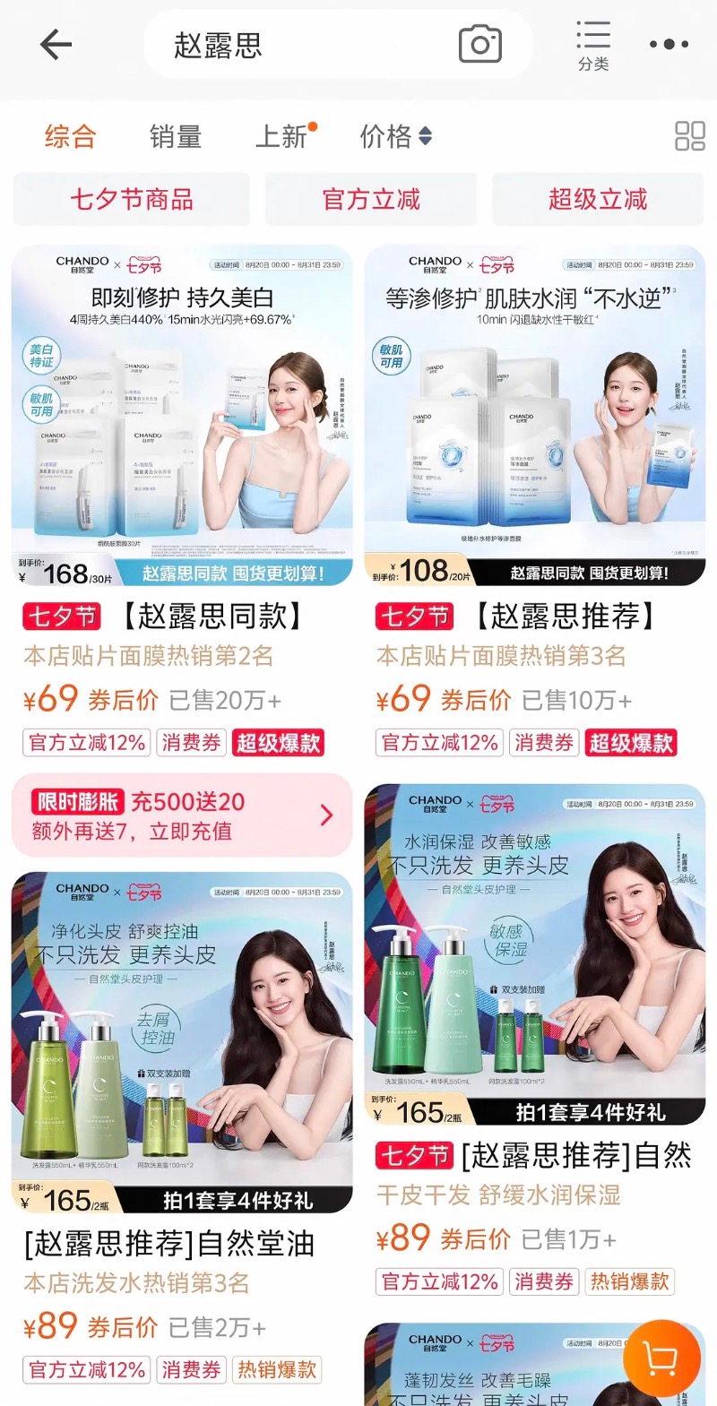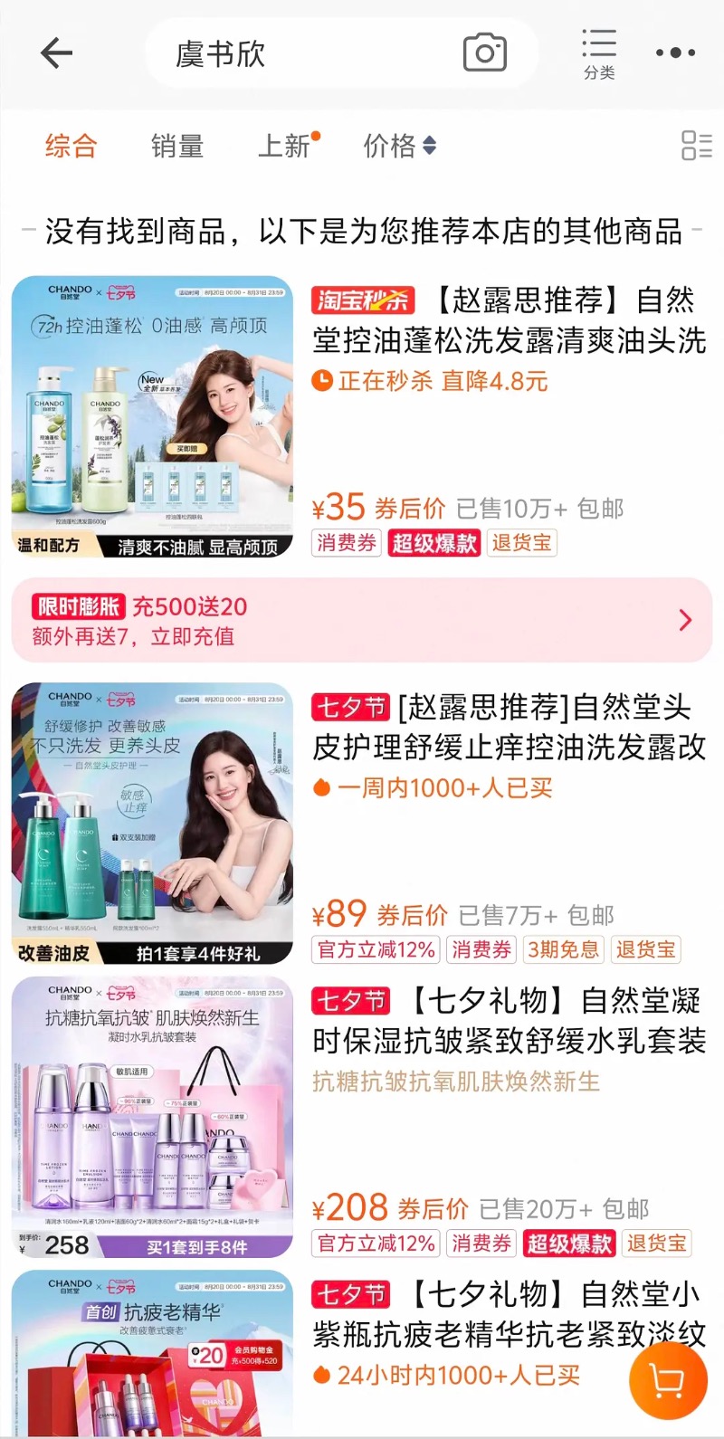 被發現官方店已經沒有虞書欣相關鏈接,目前搜尋「虞書欣」只會出現另一個代言人趙露思👇