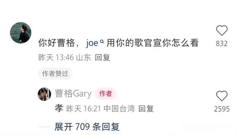 對於兒子在官宣時先用自己的歌,曹格更搞笑回應:「孝」👇