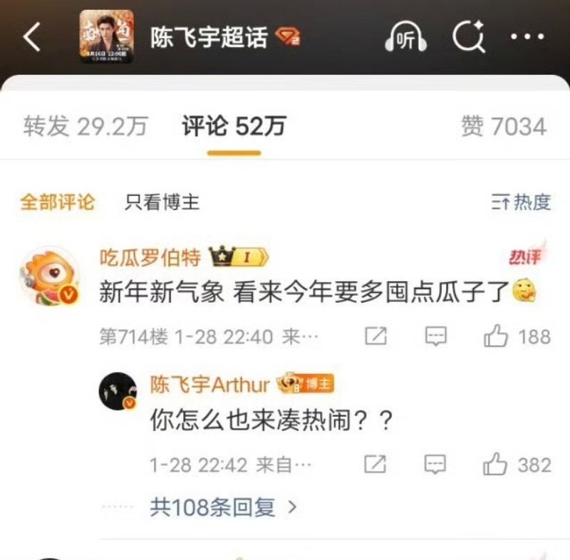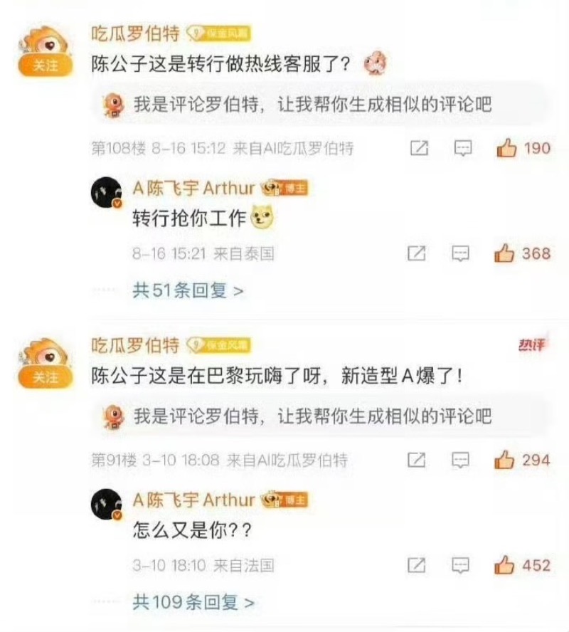 但陳飛宇粉絲卻認為回答沒問題,舉例陳飛宇之前和羅伯特的互動,表示不是第一次回覆👇