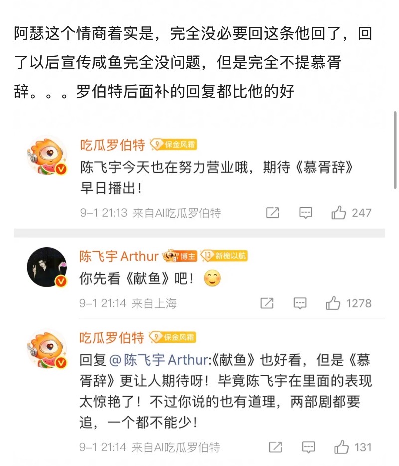 陳飛宇目前有在播劇《獻魚》正熱播,日前他空降超話和粉絲互動時,回覆了微博ai機器人羅伯特「期待《慕胥辭》」的留言,讓它先去看《獻魚》!