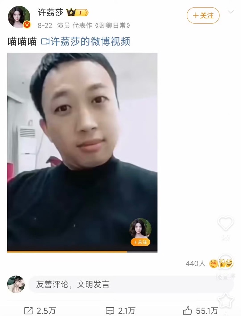 網友發現之前和于正公開對線時,許荔莎曾放出于正影片配文「喵喵喵」👇
