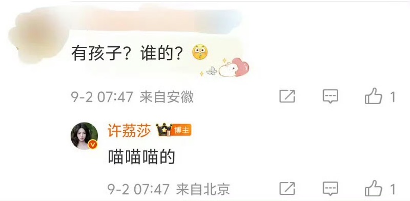網友從許荔莎公開的資料,陸續扒出了細節!首先許荔莎回應網友表示孩子是「喵喵喵的」👇