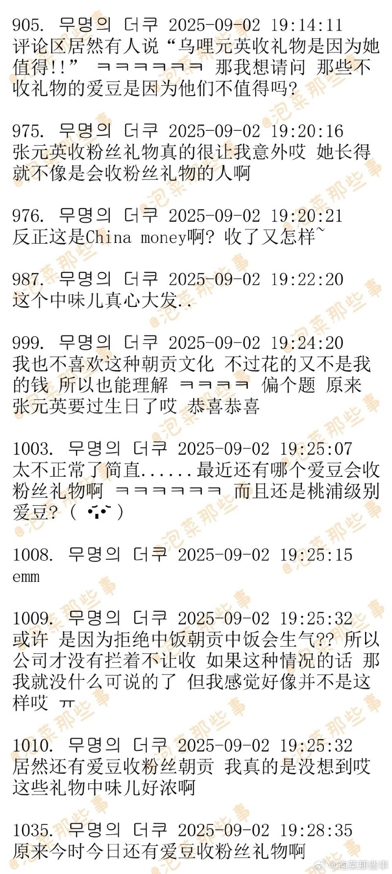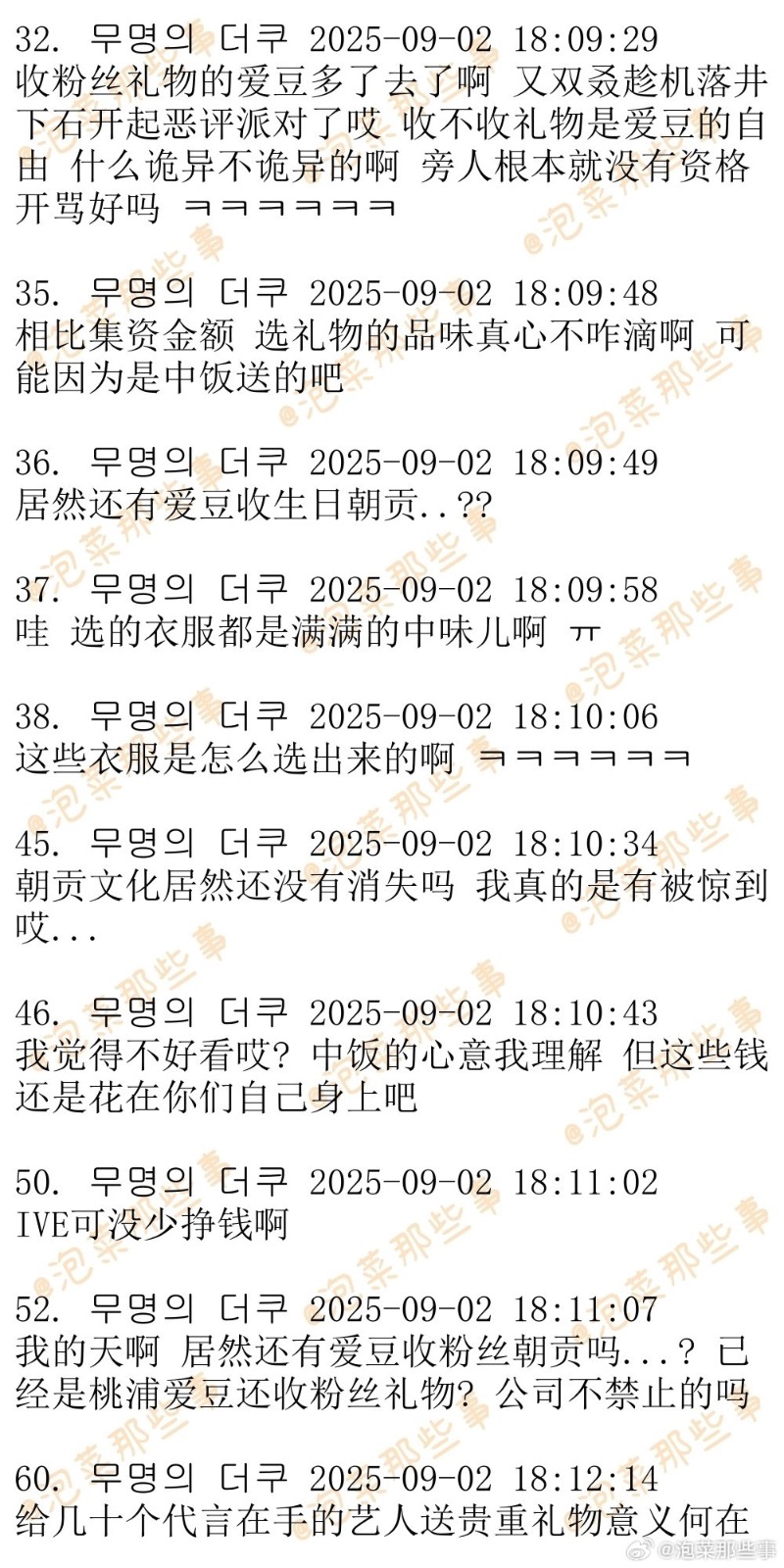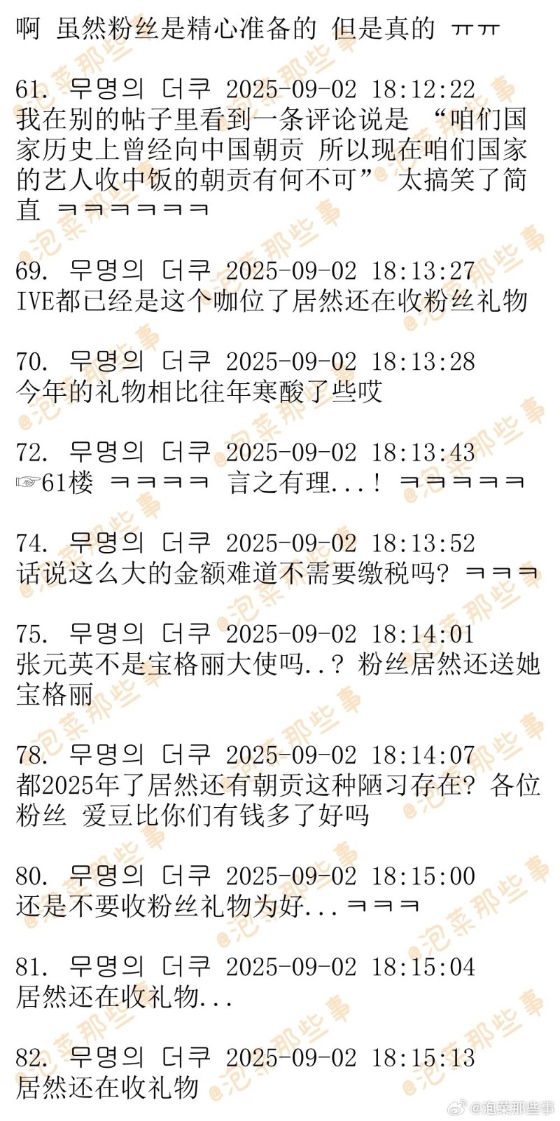 列表公開之後,韓網幾乎都在炮轟接受粉絲禮物的張員瑛,認為IVE名氣這麼大,居然還在接受粉絲朝貢,韓網覺得十分不可思議!也有的認為中粉送上的禮物「中味」十足,評論看起👇