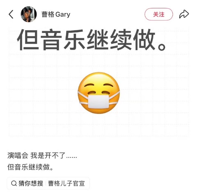 到底怎麼一回事呢?原來是曹格發了一則貼文,表示自己開不了演唱會,但會繼續做音樂👇