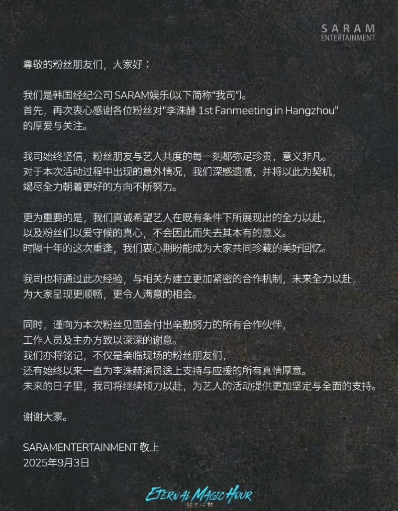 一直到3號,李洙赫所屬社SARAM ENTERTAINMENT才遲來地表明了立場,表示:「對于活動過程中發生的意外情況深表遺憾」,「將以此次事件為契機,努力向更好的方向改進。」
