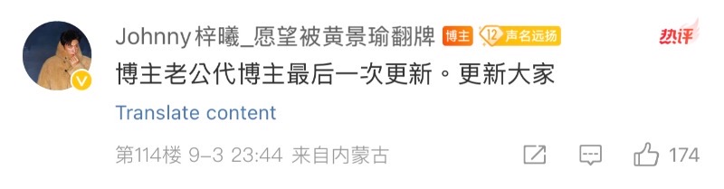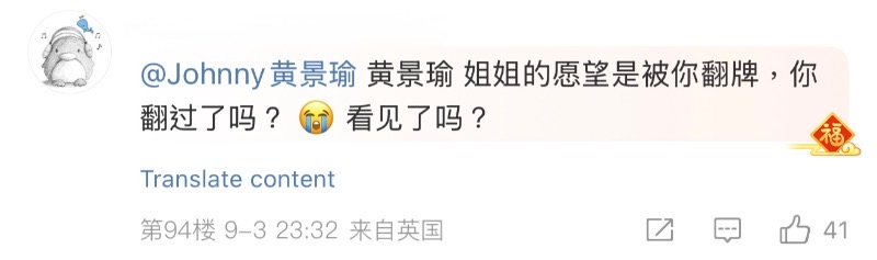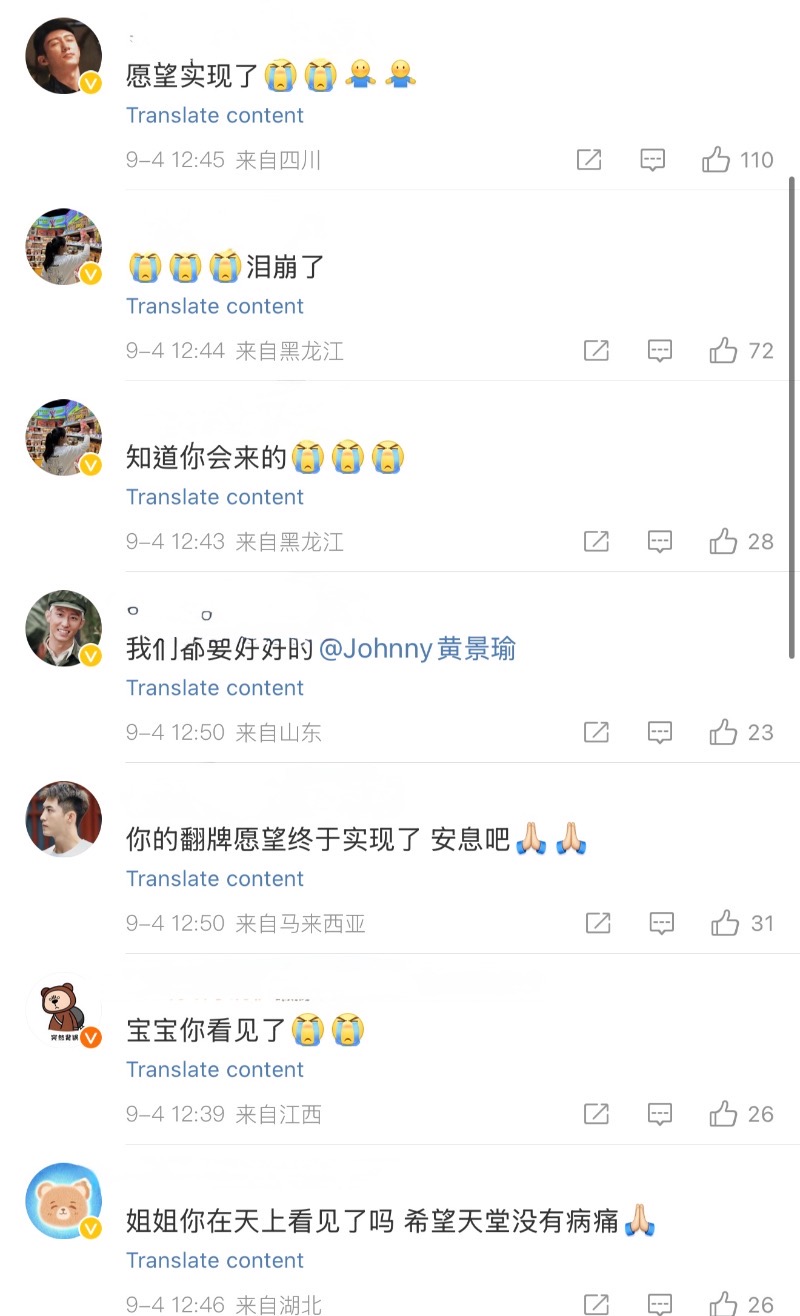 事情的起因,是黃景瑜其中一個超話大粉更新微博,內容卻讓人相當遺憾,原來這位粉絲因心力衰竭逝世,最後給同擔們帶來的話是「鯨魚加油繼續前行#加油加油##黃景瑜##鯨魚#,我先去天堂了。」
