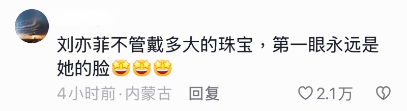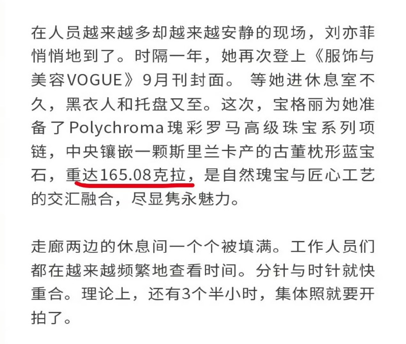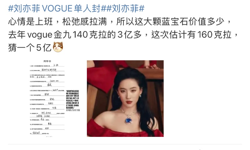 根據時尚博主推測,之前劉亦菲曾佩戴價值3億多(人民幣,下同)拍攝去年9月的雜誌封面,因此推測今年這顆,至少價值5億!