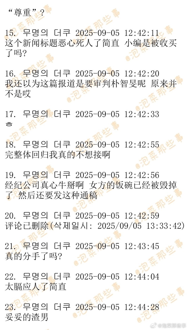 在報導中,韓媒也再次強調其所屬社BIGHIT MUSIC發表的立場,那就是:「出於對智旻私生活及相關當事人的尊重,我們此前一直未表明立場」、「但由於出現諸多圍繞藝人私生活的推測性報道及不實謠言,不得不公開最基本的事實關係——智旻與對方曾互交往過,但那是數年前的情況,目前二人已非交往關係。」