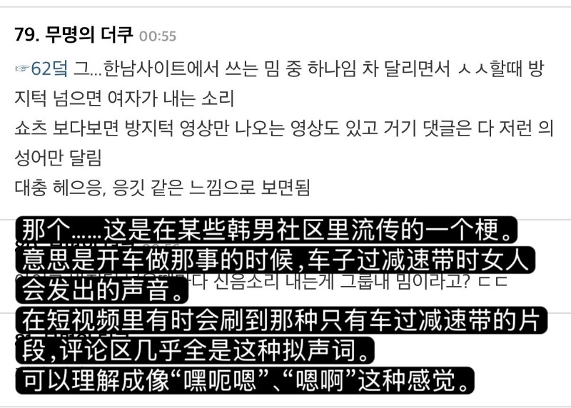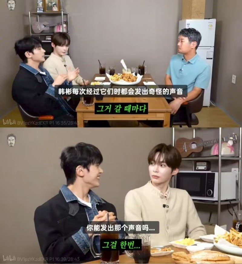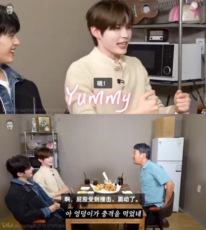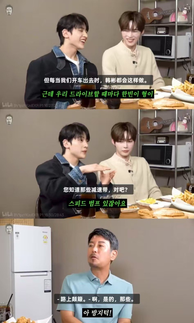 隨後,成韓彬解釋表示:「如果快速通過減速帶,屁股不是會疼嗎?那時候我們之間會用一個梗,目的是爲了逗孩子們笑。」隨即他做出了過減速帶的樣子,用女聲發出了「呃呃」的聲音,之後在大家的再次要求下,又用「呃呃」的聲音表演了一次。