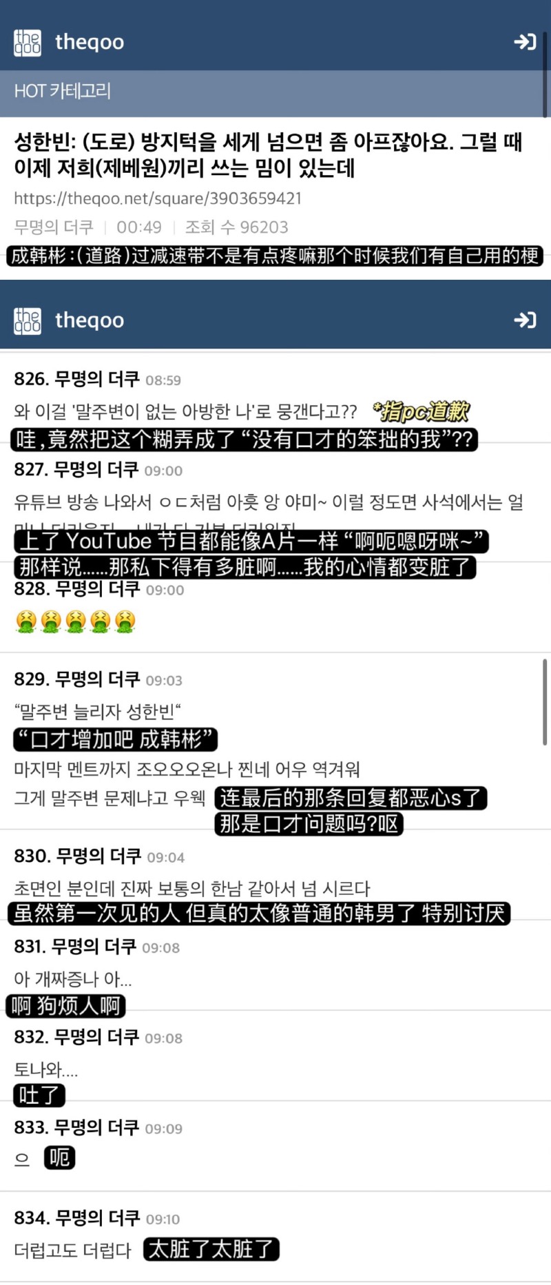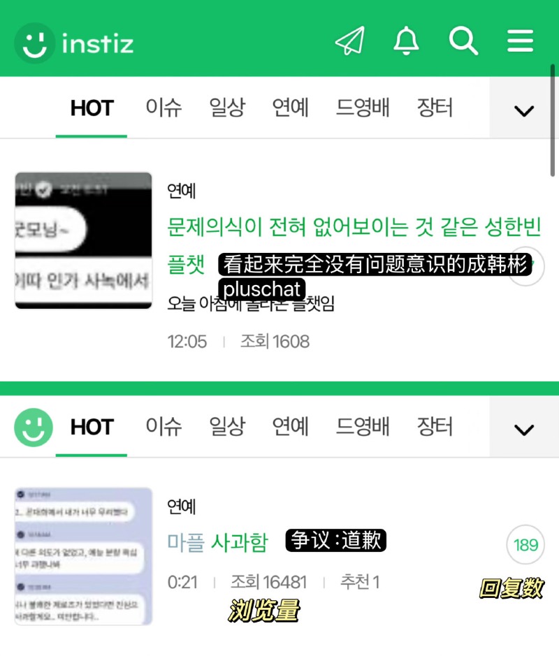 隨著爭議擴大,成韓彬透過Bubble發文道歉,表示:「哎呀…我在節目裡真的太過了。完全沒有其他意圖,可能是我對綜藝節目份量的野心太大了。如果因此有不愉快的ZEROES的話,我真心道歉。對不起。努力提升口才吧!成韓彬!」