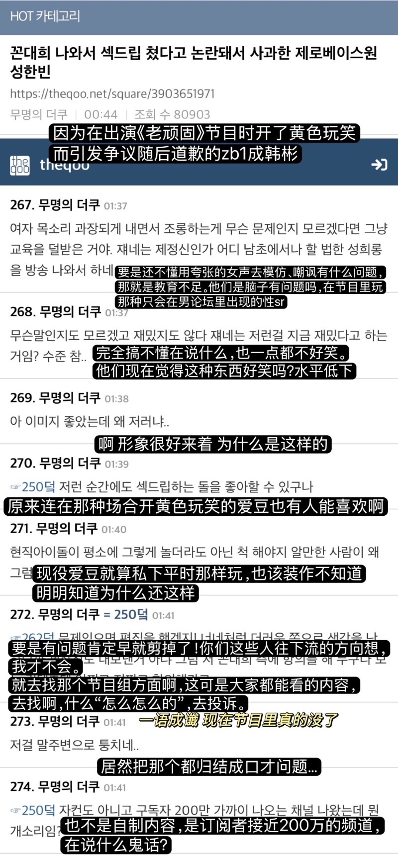 ZEROBASEONE(ZB1)成員成韓彬與石馬修,日前參與了諧星金大熙主持的節目《ggondaehee》(《吃飯吧 老頭熙》),結果因為節目中的發言被炮轟了!
