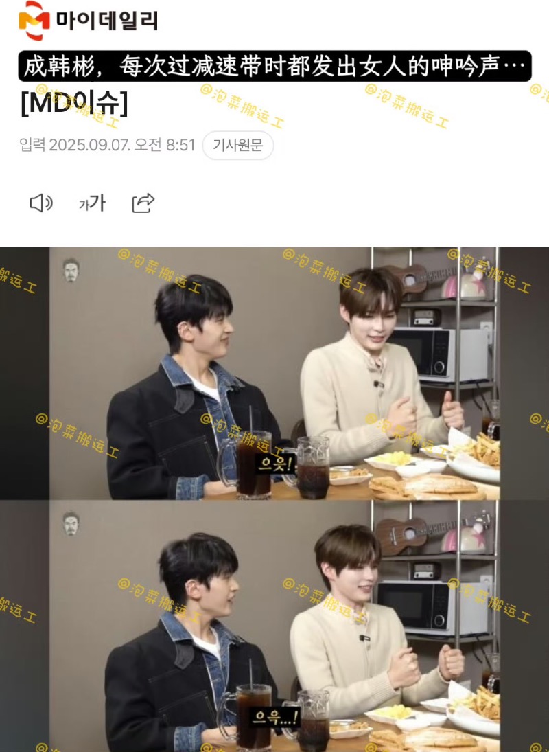 事情的起因,是馬石修提到了成韓彬不為人知的一面,表示:「我也有一個故事。成韓彬哥一直給人一種乾淨利落的形象。我們每次開車的時候不是有減速帶嘛?每次過減速帶時,他都會發出神奇的聲音。」成韓彬反問「什麼呀」,石馬修笑着表示:「別假裝不知道。」