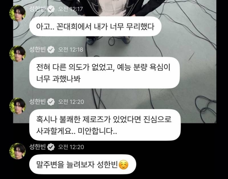 隨著爭議擴大,成韓彬透過Bubble發文道歉,表示:「哎呀…我在節目裡真的太過了。完全沒有其他意圖,可能是我對綜藝節目份量的野心太大了。如果因此有不愉快的ZEROES的話,我真心道歉。對不起。努力提升口才吧!成韓彬!」