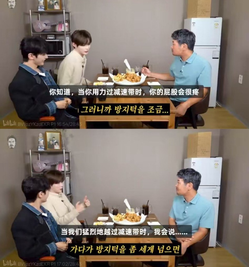 隨後,成韓彬解釋表示:「如果快速通過減速帶,屁股不是會疼嗎?那時候我們之間會用一個梗,目的是爲了逗孩子們笑。」隨即他做出了過減速帶的樣子,用女聲發出了「呃呃」的聲音,之後在大家的再次要求下,又用「呃呃」的聲音表演了一次。