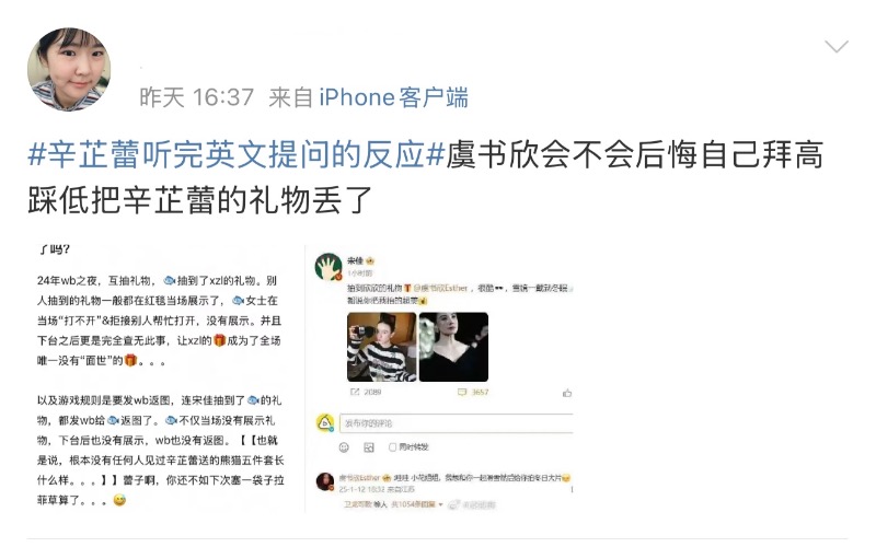 雖然但是,今年的微博之夜,辛芷蕾準備的禮物,卻成為了全場唯一沒有被公開的禮物,而抽中的她禮物的,就是虞書欣👇