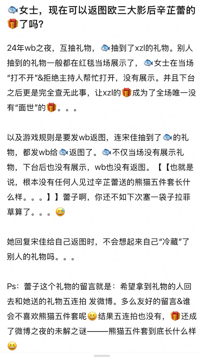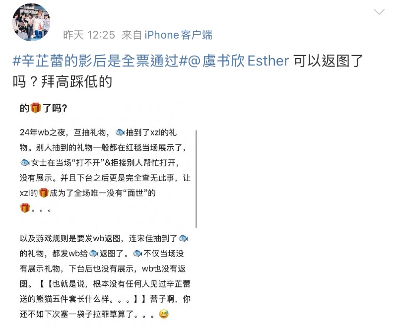 BUT,事後虞書欣也並沒有發博公開辛芷蕾的禮物,如果說她是忘記了,但是她偏偏記得回復抽中了她禮物的宋佳👇