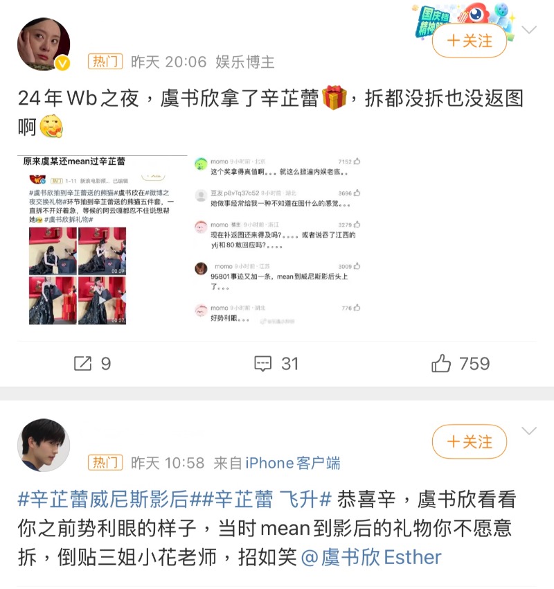 雖然但是,今年的微博之夜,辛芷蕾準備的禮物,卻成為了全場唯一沒有被公開的禮物,而抽中的她禮物的,就是虞書欣👇