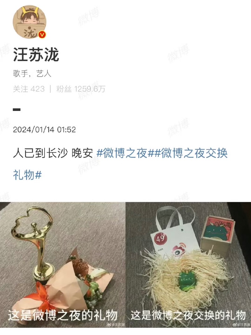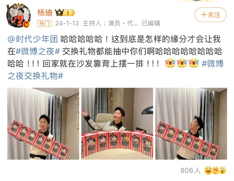 這究竟怎麼一回事呢?這就不得不重溫今年初的《微博之夜》交換禮物環節啦!眾所周知,連續兩年的微博之夜,出席的藝人都需要準備禮物交換,按照規則,一般都會在現場公佈自己抽中什麼禮物,比如這樣👇