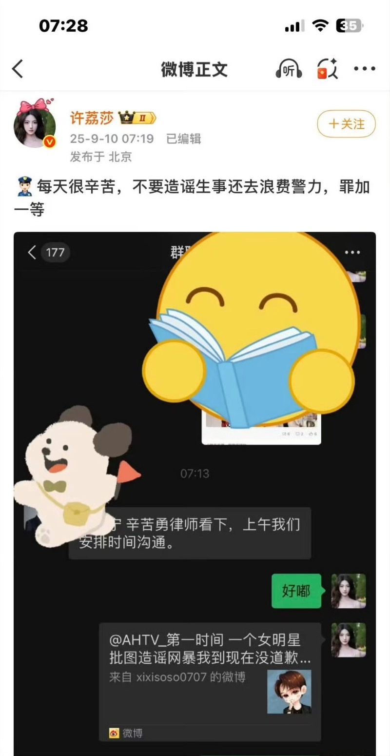 巧合的是,許荔莎在10號一早,就發了一則微博,曬出了一張聊天截圖,配文:「警察每天很辛苦,不要造謠生事還去浪費警力,罪加一等」而聊天截圖中,疑似她和代表律師的聊天,隨後這則貼文被刪除👇