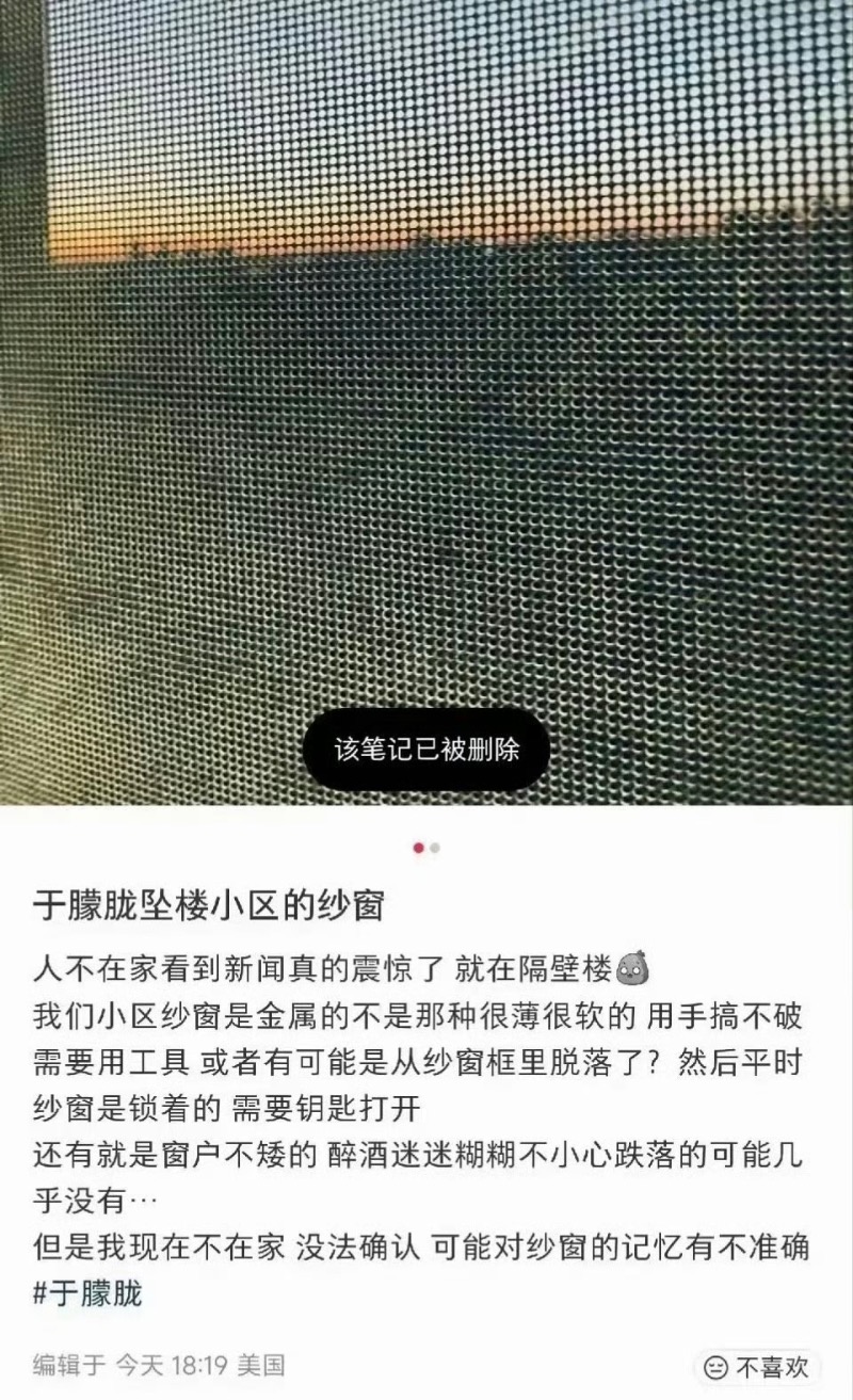 此前,有IP在美國的網友發帖,表示自己就是住在該小區的居民,這小區的紗窗是金屬的,用手是不可能破壞,需要動用工具。另外強調窗戶不矮,因為醉酒不小心跌落的可能性幾乎沒有。貼文被瘋狂轉發,但隨後被刪除。