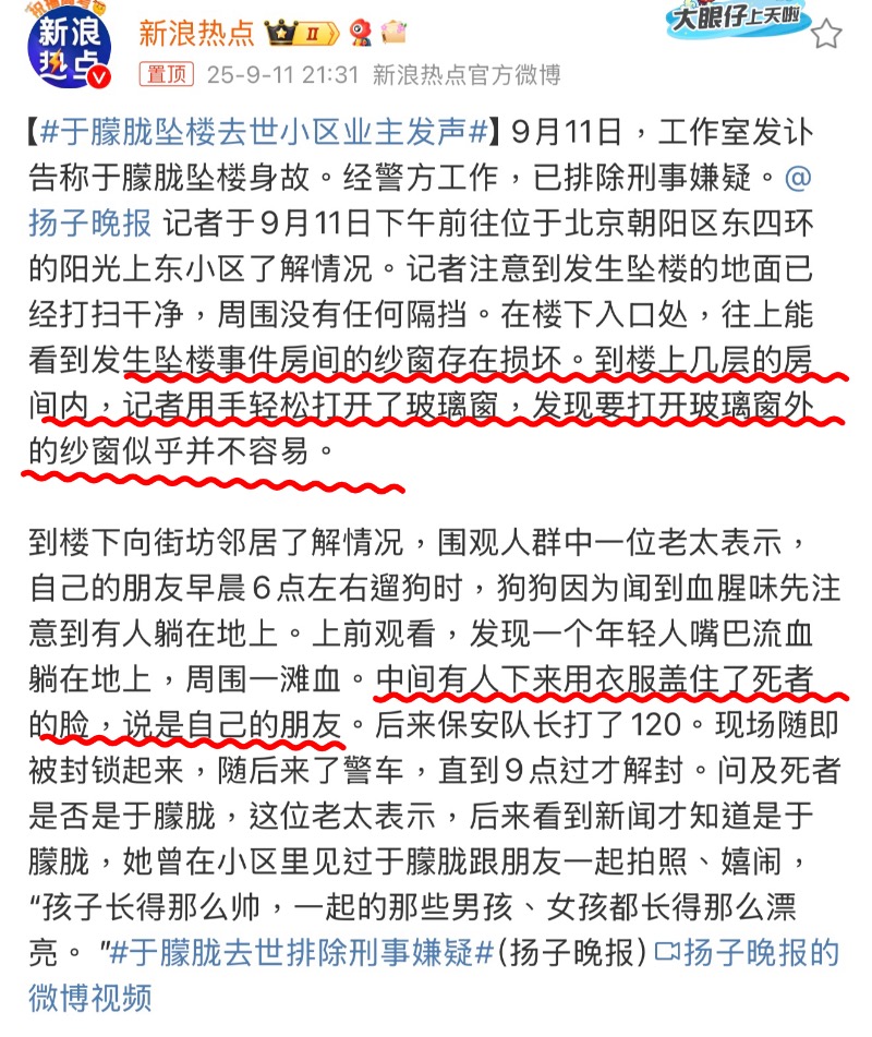 于朦朧在11號於北京一小區墜樓逝世,工作室沉默一天後,在傍晚發訃告證實死訊,並強調:排除了刑事嫌疑!雖然但是,評論區網友都在要求一個真相👇