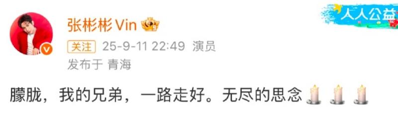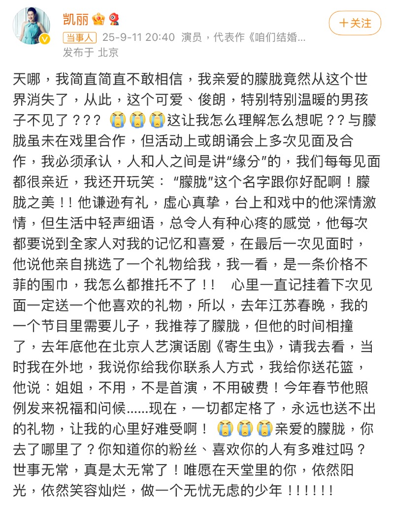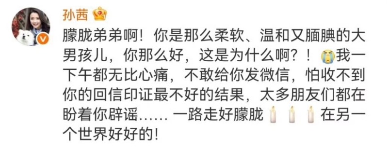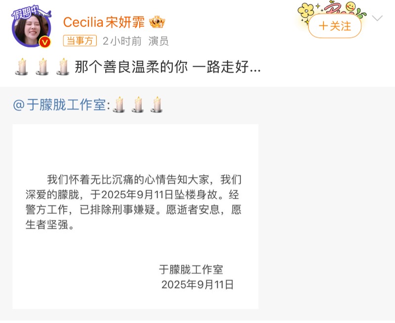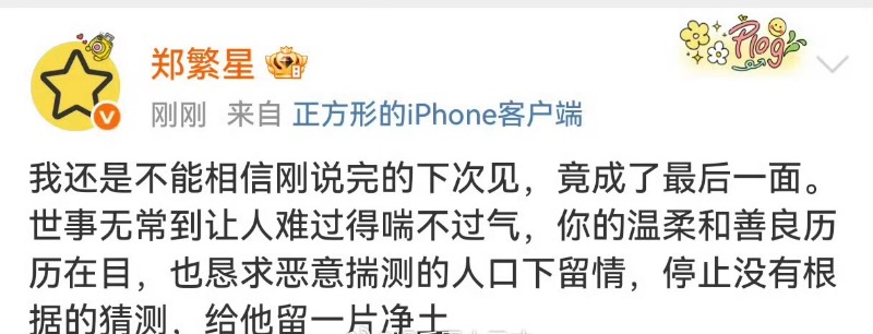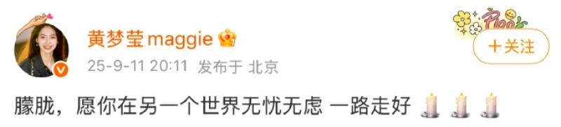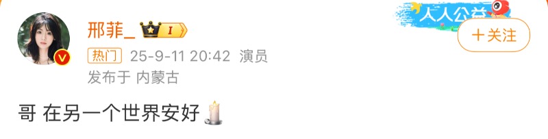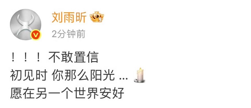演藝圈方面,藝人們紛紛發文悼念于朦朧,當中包括了:邢菲👇