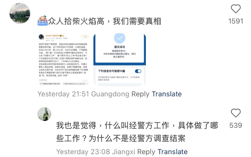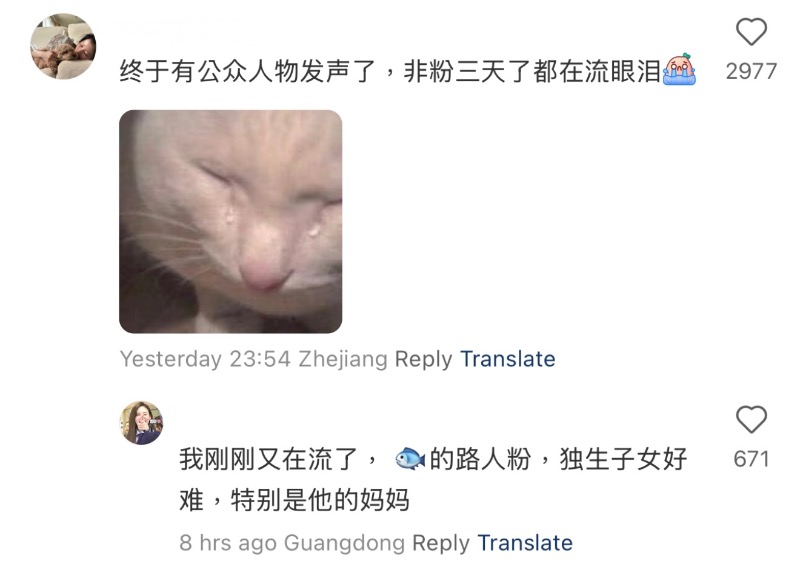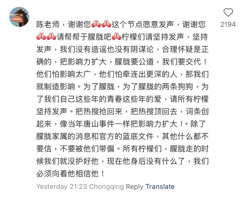 雖然眾多藝人發了悼念,但曾一起參加了《追光吧哥哥》的陳曉東,則是第一個公開質疑死因的藝人,被網友視為「為于朦朧發聲!」