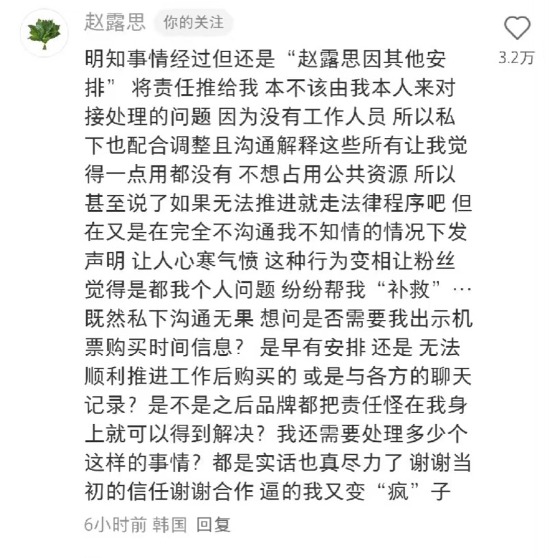 2)品牌方心知真正原因,結果還是在沒告知對方情況下發了這種聲明,最後背鍋的還是趙露思。