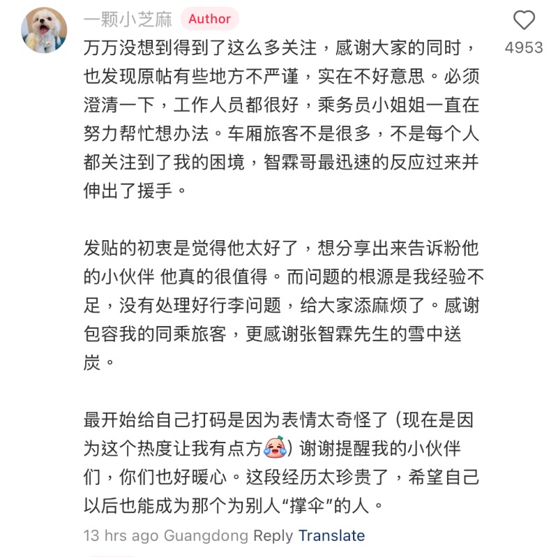 這篇文章獲得了極高點擊率,隨後原Po再發文解釋,表示其實乘務員小姐姐也在努力幫忙,但張智霖是最迅速過來伸出援手的人👇