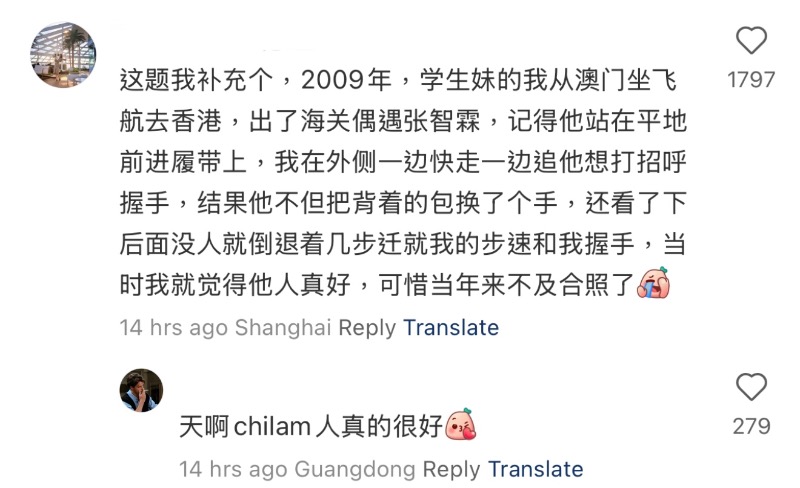 而在評論區,也有不少網友分享自己曾偶遇張智霖的溫暖經歷👇