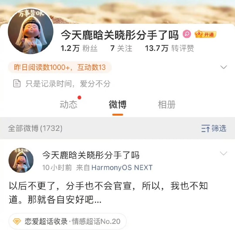 隨著鹿晗未卡點送祝福,已經打卡2900天的「今天鹿晗關曉彤分手了嗎」分手博,也官宣從今天起停更👇