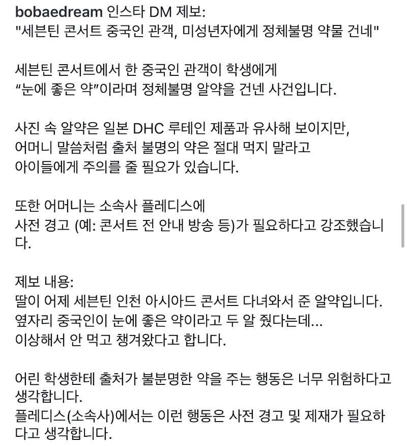 「在Seventeen演唱會上,一名中國觀眾對一名學生說「對眼睛好的藥」,並遞上了來歷不明的藥片。照片中的藥片看起來和日本DHC賣的保健品類似,但正如投稿人母親所說,不明來歷的藥絕對不能隨便吃,需要提醒孩子們注意。投稿人的母親還強調,有必要讓所屬公司 Pledis在事前進行提醒(例如:演唱會前的廣播通知等)