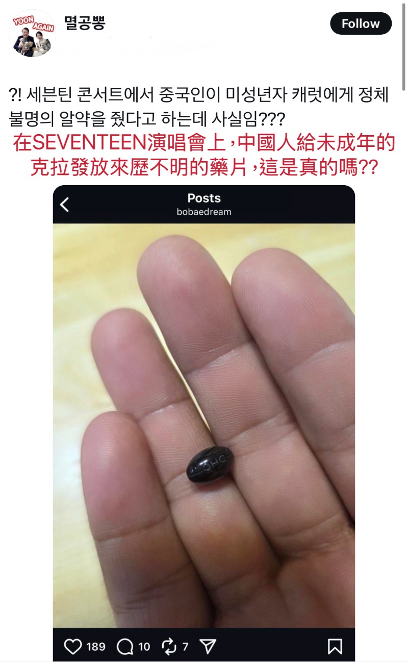 這則報導立刻在X上引起熱議:「在SEVENTEEN演唱會上,中國人給未成年的克拉發放來歷不明的藥片,這是真的嗎??」👇